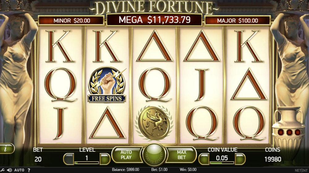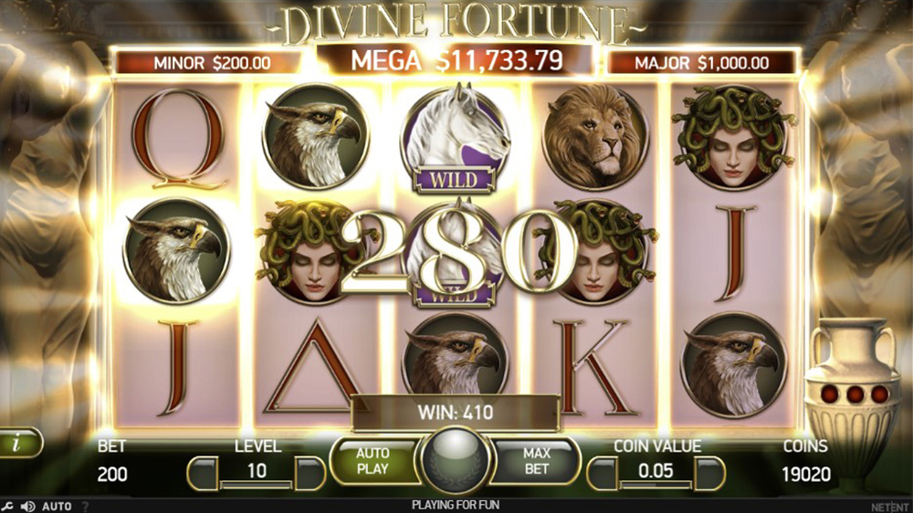 Divine Fortune je online slot proizvođača NetEnt s RTP-om od 96,59%. Ima 20 isplatnih linija na 5 valjaka i nudi značajke poput besplatnih vrtnji, wild simbola koji padaju za jedno mjesto i pokreću novu vrtnju. Divine Fortune dostupan je u demo verziji ili za pravi novac s maksimalnim ulogom od 100 €. Ova igra poznata je po svojoj mitološkoj temi i prilici za osvajanje velikih nagrada. To joj daje posebno mjesto među NetEntovim klasicima.