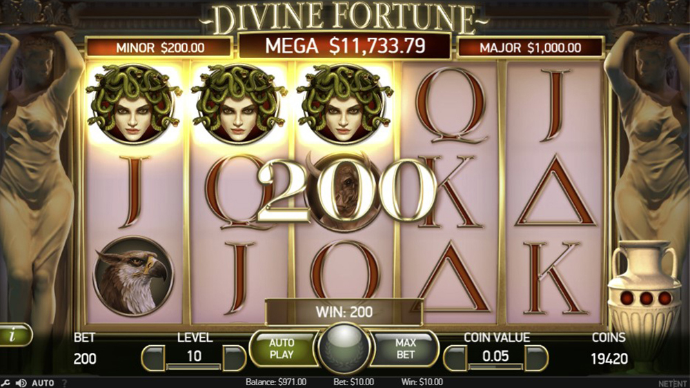 U ovom slotu možeš vrtjeti valjke već po iznosu od 0,20 €. Ovaj minimalni ulog prihvatljiv je i za početnike. Maksimalni ulog od 200 € osigurava put prema većim dobitcima te pristup bonus funkcijama. Divine Fortune jedinstvena je casino igra jer nudi progresivni jackpot. Možeš osvojiti čak tri sjajna jackpota, a svima je omiljeni veliki, odnosno mega jackpot. Riječ je o progresivnom jackpotu, što znači da raste što više igrača igra igru, sve dok ga jedan sretnik ne osvoji.