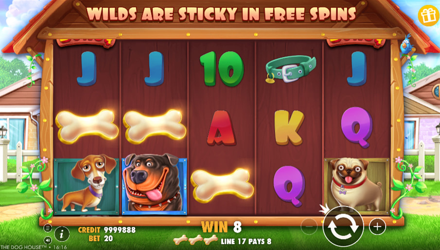 Kućica za pse djeluje kao wild simbol i zamjenjuje sve ostale simbole osim scatter simbola. Scatter simbol je, kao što smo ranije spomenuli, simbol pseće šape. Najmanje 3 scatter simbola pokreće atraktivne besplatne vrtnje. Množitelji mogu značajno povećati tvoje dobitke. Fiksnih 20 isplatnih linija nudi stalne prilike za dobitak, a kombinacija visokoplaćenih, niskoplaćenih simbola te scattera čini igru zabavnom i uzbudljivom. Intuitivne kontrole i pregledno sučelje omogućuju brzo razumijevanje svih značajki, čak i novim igračima. Sve ove karakteristike pružaju dinamično i nagrađujuće iskustvo igranja The Dog House slota.